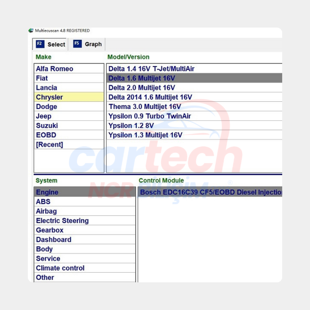 Fiat MultiEcuScan Arıza Tespit Yazılımı, Fiat, Alfa Romeo, Lancia, Chrysler ve Dodge araçları için özel olarak geliştirilmiş bir araç bakım ve onarım yazılımıdır. OBD-II arıza kodlarını okuyabilir, motor, şanzıman, ABS gibi sistemlerdeki arızaları tespit edebilir ve bakım işlemleri için gerekli verileri sağlar. Ayrıca, yağ değişimi sıfırlama, fren kontrolü ve daha birçok servis fonksiyonuna sahiptir. Kullanıcı dostu arayüzü ve geniş araç uyumluluğu ile profesyonel servislere ve araç sahiplerine kapsamlı bir çözüm sunar.