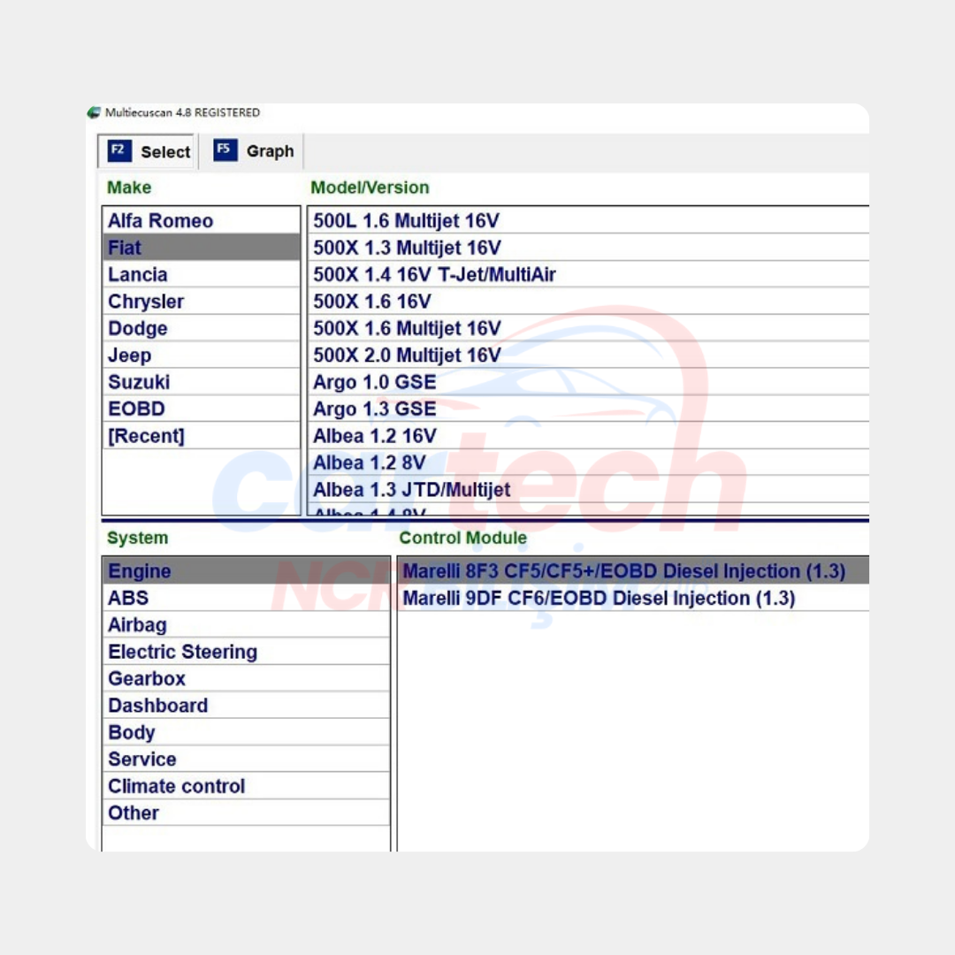 Fiat MultiEcuScan, Fiat Grubu araçları için özel olarak geliştirilmiş bir arıza tespit yazılımıdır. Bu yazılım, Fiat, Alfa Romeo, Lancia, ve diğer Fiat Grubu markalarının araçlarının motor, şanzıman, ABS, hava yastığı, klima gibi birçok sisteminin arıza tespiti ve bakımı için kullanılır. Hem binek araçlar hem de ticari araçlarla uyumludur, bu da geniş bir kullanıcı kitlesi için pratik bir çözüm sunar.