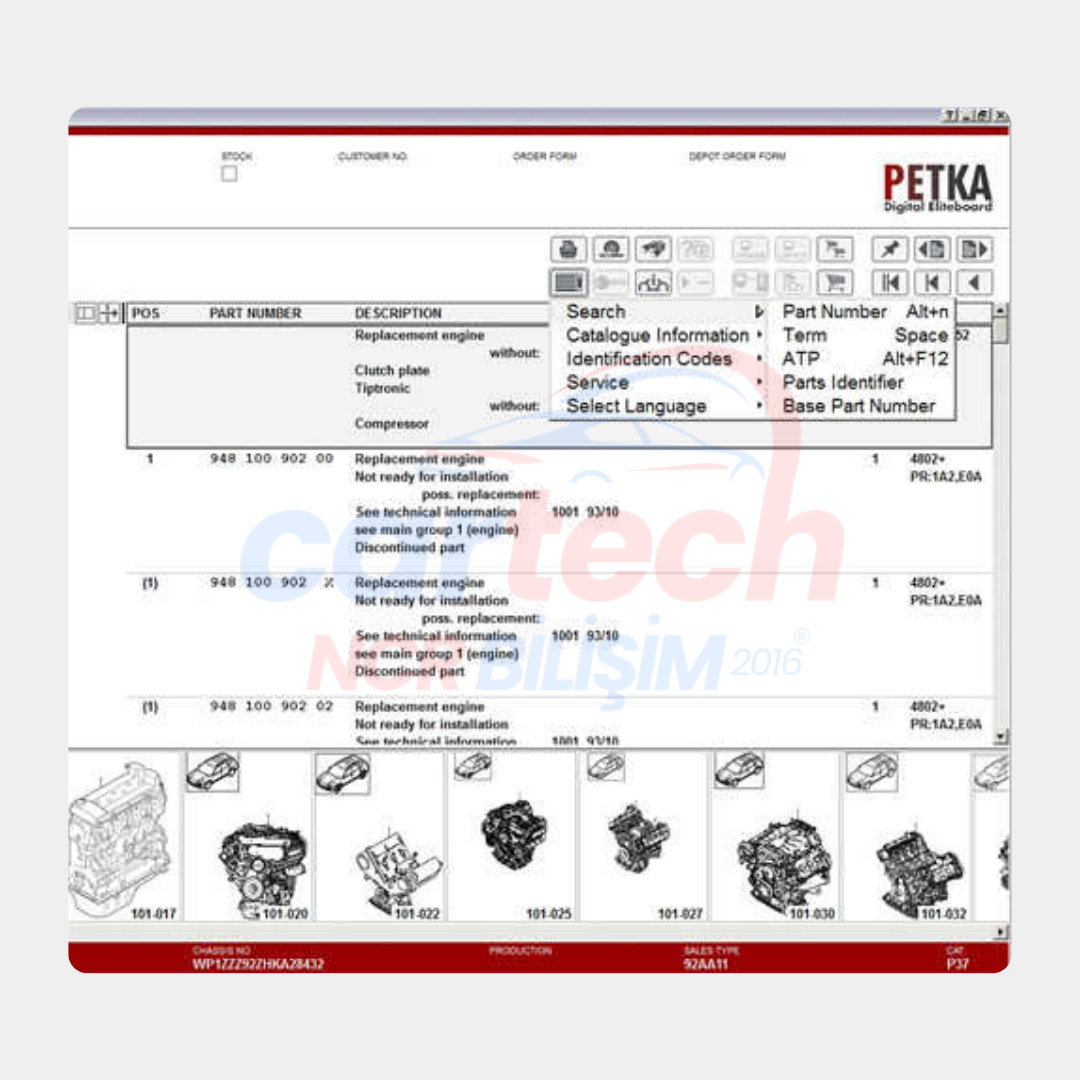 PETKA, Volkswagen (VAG) Grubu araçları için özel olarak tasarlanmış bir yedek parça katalog yazılımıdır. Bu yazılım, araç tamirhaneleri, servis merkezleri ve yedek parça satıcıları için detaylı yedek parça bilgileri sunar. Volkswagen Grubu’nun tüm marka ve modellerine yönelik kapsamlı bir veri tabanına sahiptir ve profesyonel ihtiyaçlara göre düzenlenmiştir.